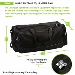 With the Champion wheeled team equipment bag you will be able to bring all of the team’s equipment with you on the go. This softball and baseball wheeled team equipment bag has an extra-large main compartment to go with large ends and side pockets to give you extra storage. The durable wheel design allows for easy transport to and from the field. The team equipment bag comes with a carrying strap with wrapped handles making it easy to move around and has heavy-duty zippers and hardware to keep your items secure.