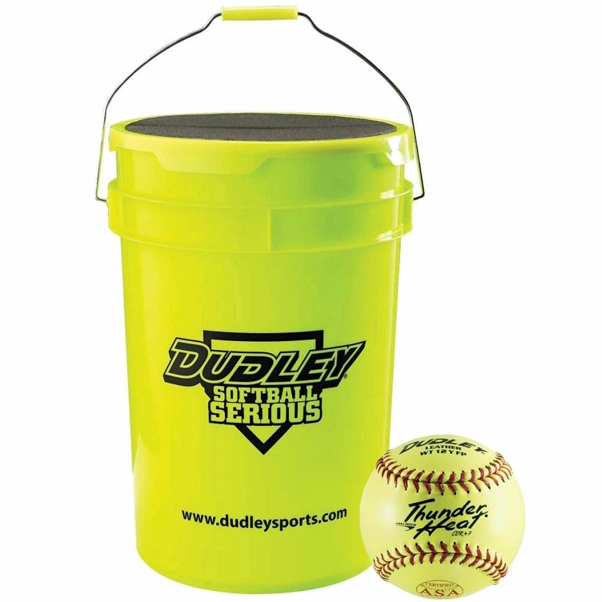 The Dudley Bucket comes with a dozen ASA Fastpitch Softballs and can hold up to 2 dozen softballs. The bucket features a lid that is padded to give you an extra comfortable seat in the dugout.