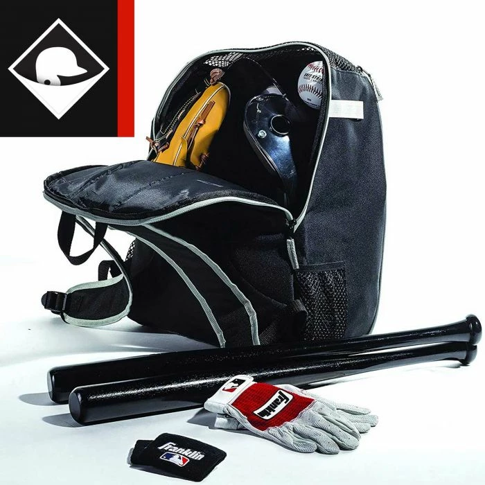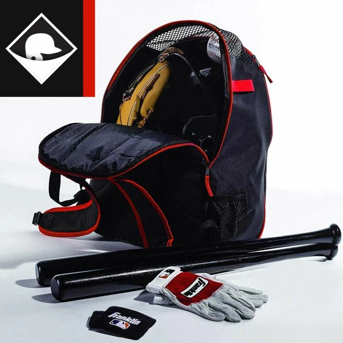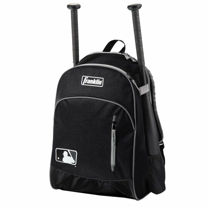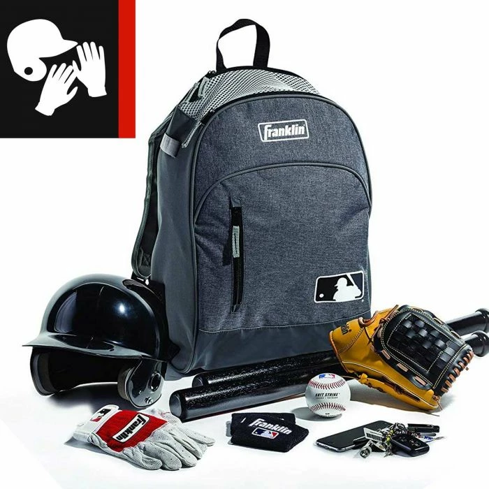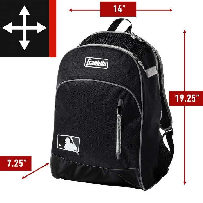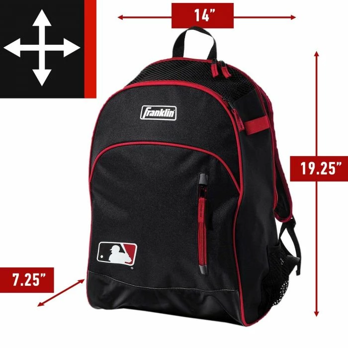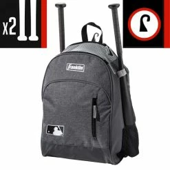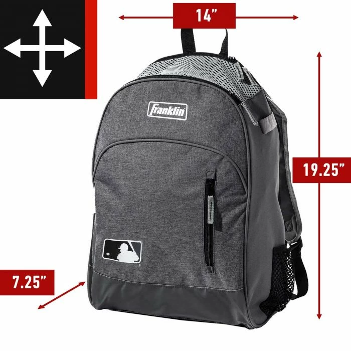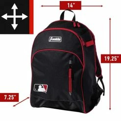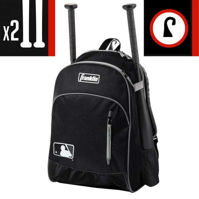 Designed to transport all your game or practice equipment in one place, Franklin’s MLB Batpack is constructed with an ultra-durable, lightweight nylon exterior and features a breathable top-side mesh compartment. The outer pockets let you carry up to two bats hands-free and the zippered front pocket is perfect for keys, ID and other small items. *LARGE STORAGE COMPARTMENT – Spacious main compartment holds baseball helmet with face mask, batting gloves, fielding glove, cleats, and various accessories *VENTILATION – top-side mesh ventilation allows breathability for airing out cleats and gloves after practice or game *EASY-USE FENCE HOOK – Convenient j-style hook allows bag to hang on dugout fence for easy accessibility *SUPERIOR PORTABILITY – Contoured, cushioned backpack-style shoulder straps provide for easy transport; quick-access dual-bat storage holds two bats that are easy to grab when on the go *CONVENIENT VALUABLES POCKETS – Top and front-access pockets safely store keys, mobile phone, wallet, and small valuables BAG SIZE – 19.25″ x 14.00″ x 7.25″ *BATS NOT INCLUDED/li>