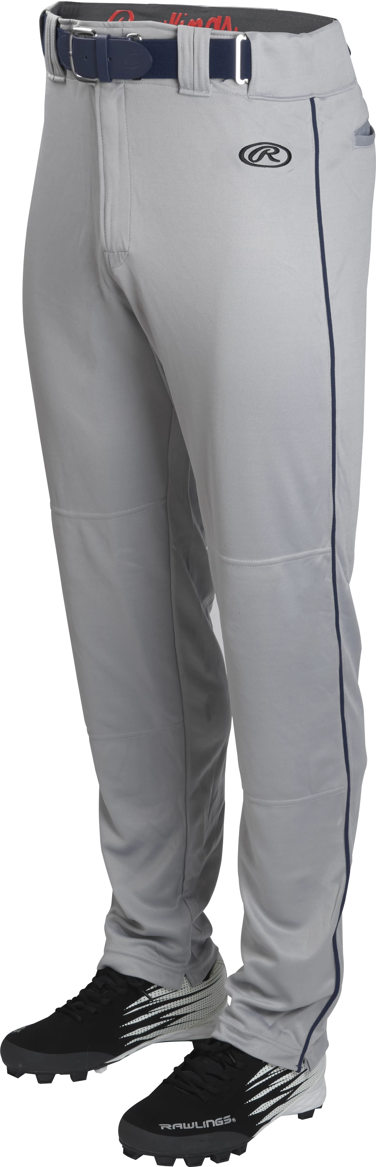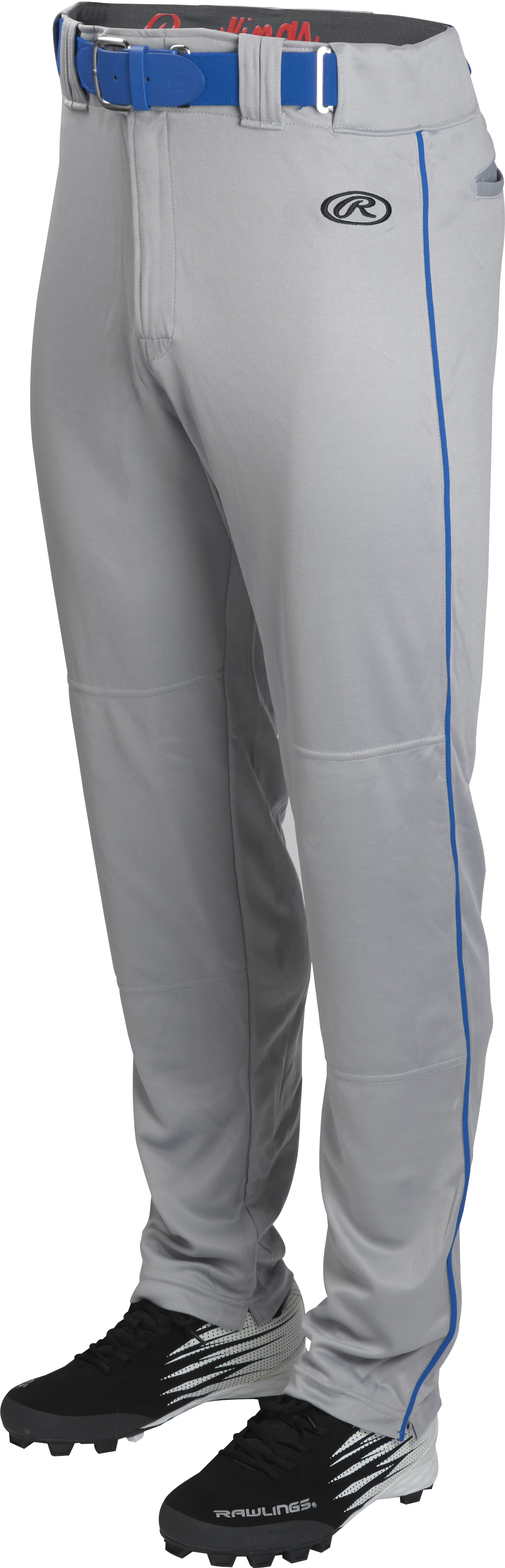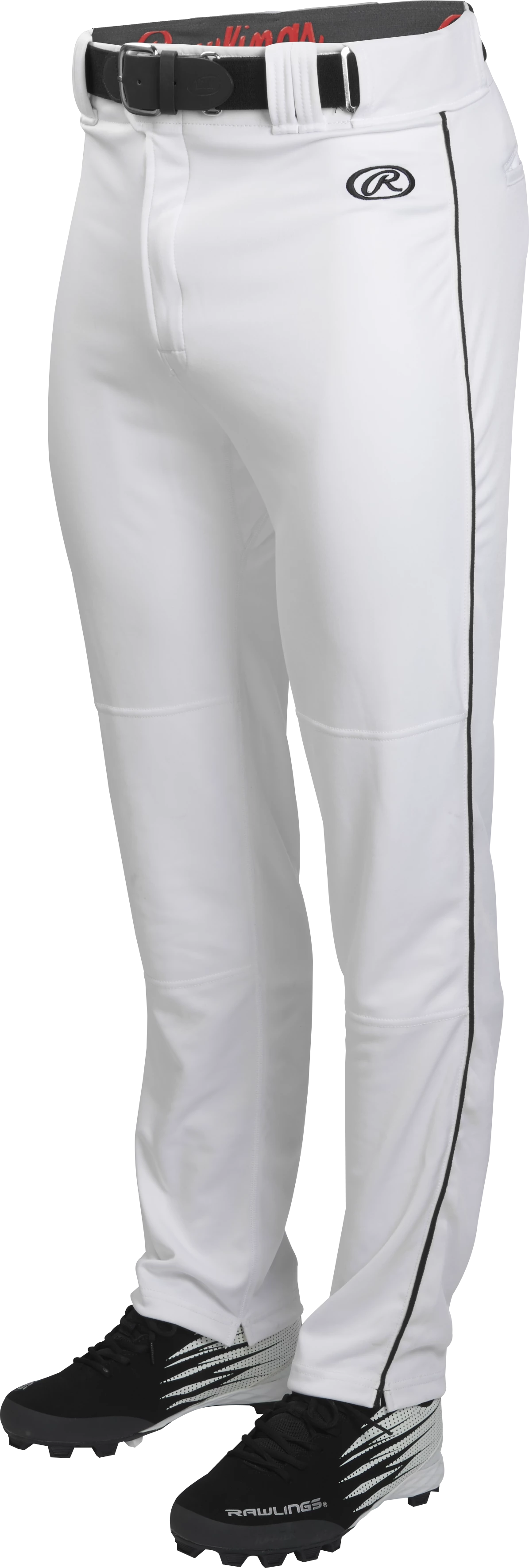 The Rawlings Youth Launch 1/8 inch Piped Full-Length premium baseball pants feature a new 150 cloth with 2-way stretch 100% polyester circular knit. These pants have all of the Pro Style features that you need in the gripper elastic waistband, flat-lock stitching, and pocket tie-downs. The zipper fly front and 2 set-in back pockets make these pants look professional.